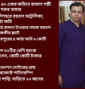 মুনিরুল তারেক, ঢাকা: চট্টগ্রামের হালিশহর থেকে ঢাকার ইস্কাটন— সর্বত্রই ছড়িয়ে রয়েছে তাদের সম্পদের বিস্তার। সরকারি চাকরিজীবী ইয়াসমীন আক্তার ও তার স্বামী মোশাররফ হোসেন রানা ভুঞা মাত্র এক যুগ আগেও সাধারণ পারিবারিক জীবন যাপন...